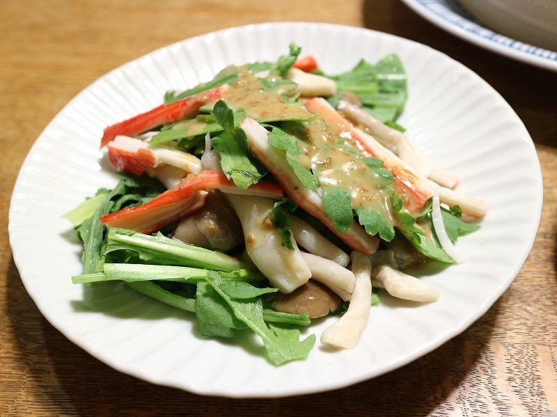 泉佐野の春菊とカニカマ、茹でたシメジをゴマドレッシングで