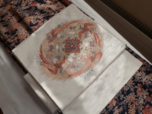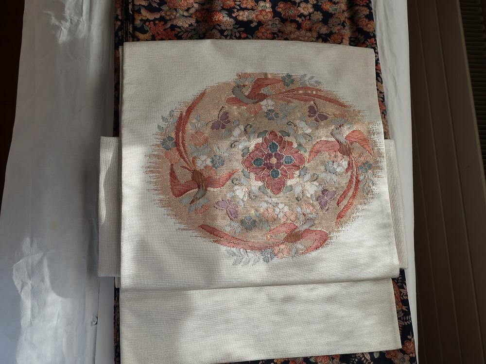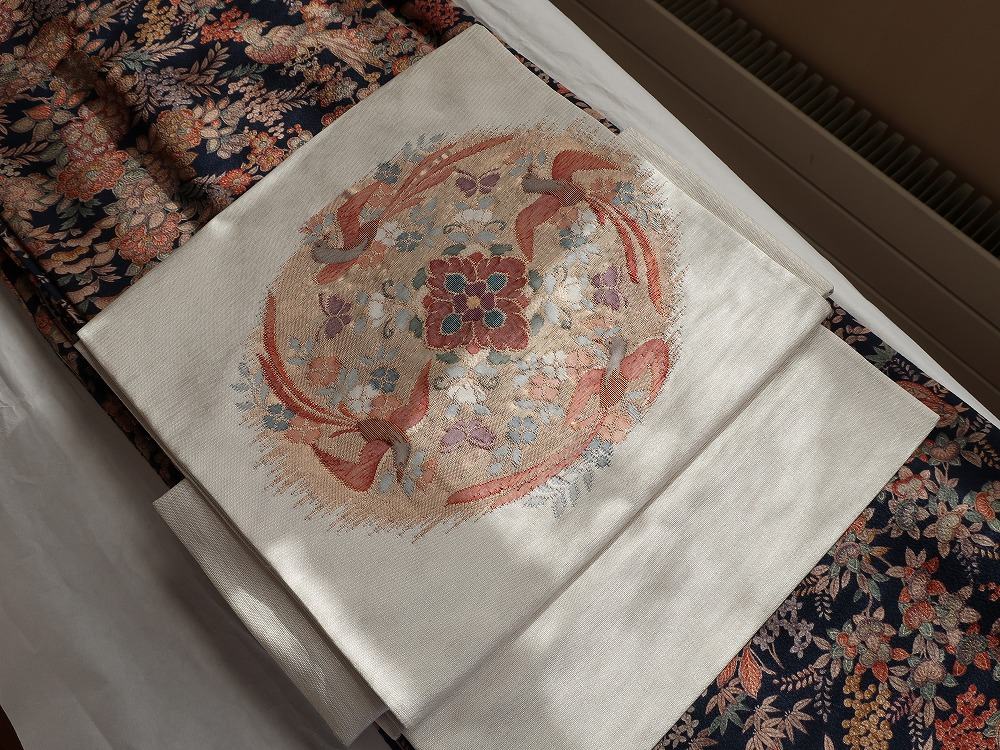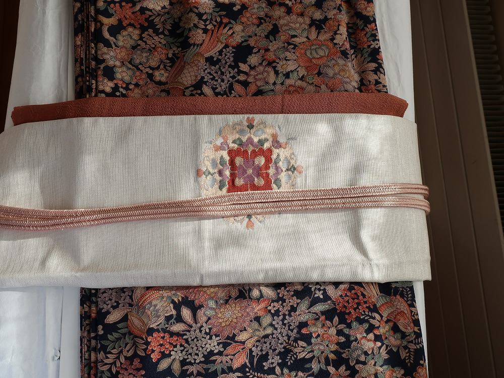 帯は、ワンポイントで無地場が多いので柄物に合わせやすいです。
