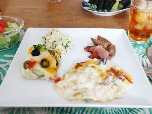 1/19-庭友ランチ 投稿日時: 2026-01-19 投稿者: はるみん庭友たちと、うちで久々おしゃべり。 作ったのはグラタンとフォカッチャとポテトサラダ グラタン(えび・ホタテ・玉ねぎ・MIXベジ・ブロッコリ) フォカッチャ(オリーブ・赤ピーマン・コーン・シュレッドチーズ) 持ち寄りの「蕎麦寿司」 サラダ(レタス・トマト) ベーコンとソーセージ ■2026/01/19(月)曇り-7.0→+0.1