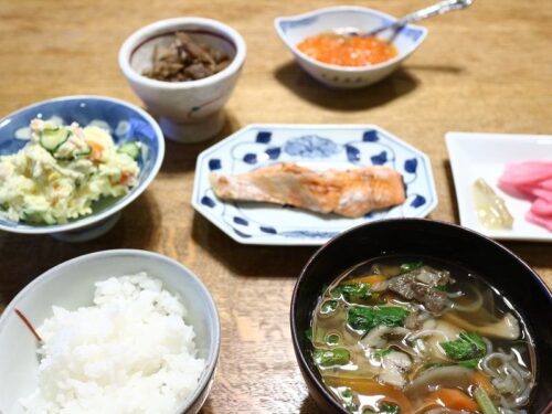 1/24-作り置きなどで 投稿日時: 2026-01-24 投稿者: はるみん ■紅鮭塩焼き■ポテトサラダ(ハム・きゅうり・玉ねぎ・MIXベジタブル) ■牛肉とごぼうの時雨煮■イクラの醤油漬け■漬物 ■芋煮風汁物(牛肉・ごぼう・人参・舞茸・白滝・大根葉・葱 ■2026/01/24(土)晴れ-10.9→-2.3
