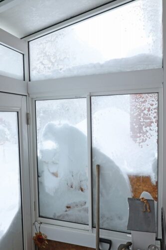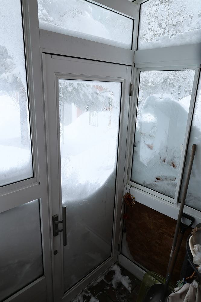 勝手口の風除室。ここも屋根からの雪落ちがあるので雪で覆われてます。