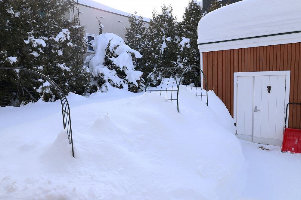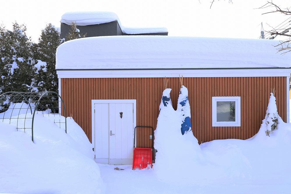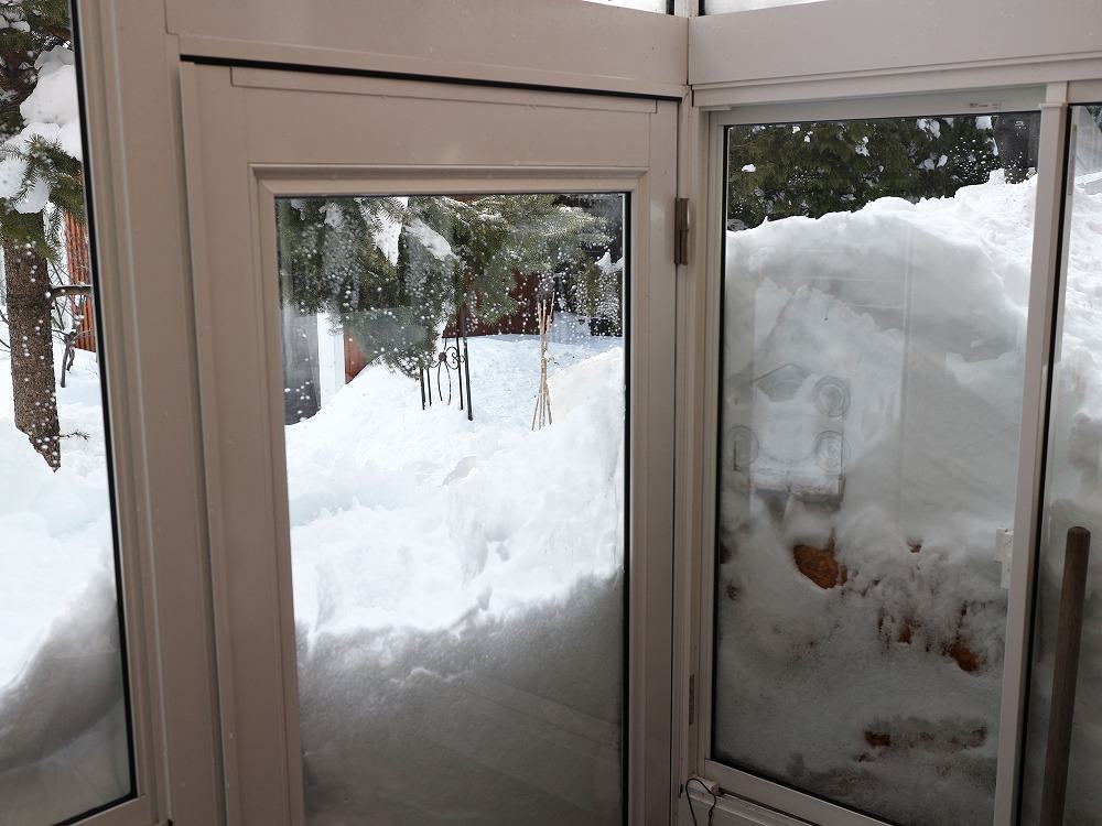 ↑の雪かきをするために、風除室のドアから出入りしてましたが、ここの雪は春までこのままということにしたので、雪穴の中状態の風除室は、お米や粉類の絶好の保管場所になってます。