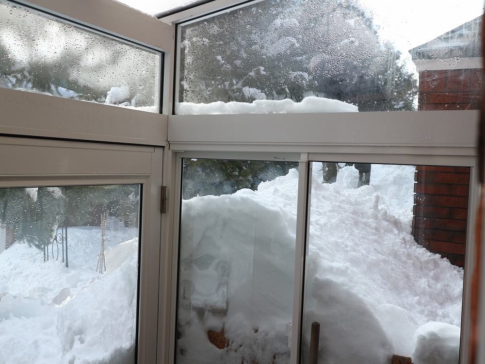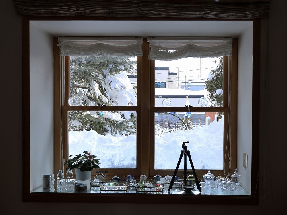 おとさん、もう少し食堂の窓を明るくしたいようで、玄関から雪山を伝って来て雪かき中です。長靴の足が見えますか?あの位置は地上から2mくらいあります。