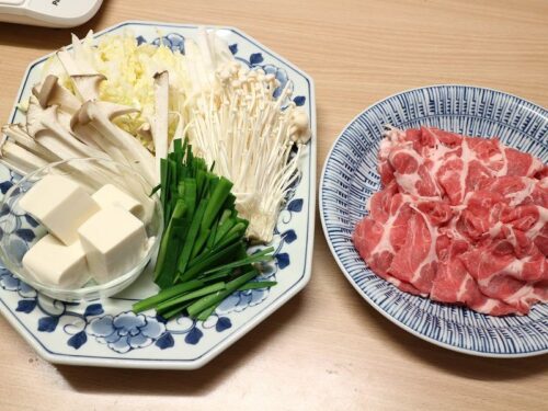 具材は、豚肩ロース、白菜、エリンギ、エノキ、葱、ニラ、豆腐