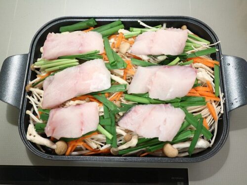 もやし、シメジ、エノキ、人参、ニラを敷いた上に、片栗粉をうっすらまぶしたタラを置いて、お酒大さじ1、水100ccを側面から入れて、蓋をして強火。
