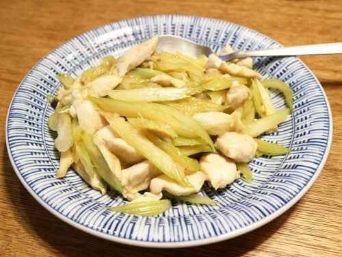 もう一品はセロリとエリンギと鶏胸肉の辛味炒め