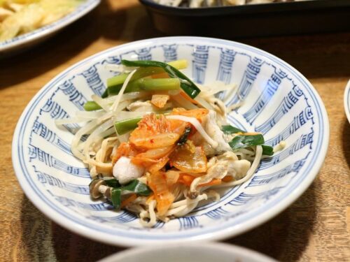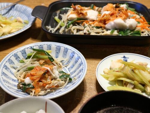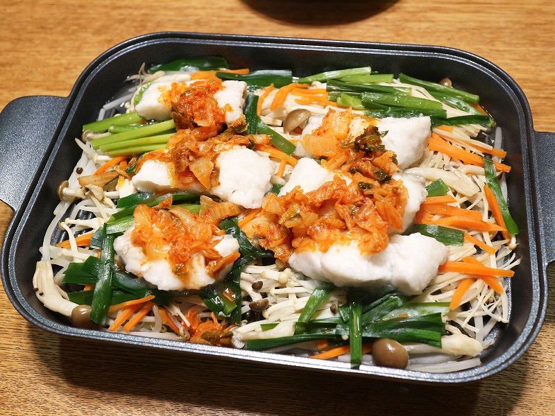 蓋を開けてタラに火が通っていたら、刻んだキムチを乗せて、ごま油を少しかけて