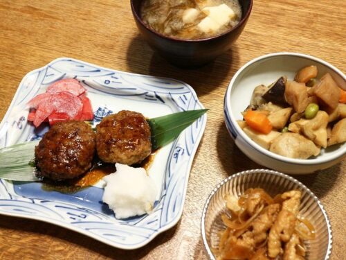2/18-豆腐ハンバーグ 投稿日時: 2026-02-18 投稿者: はるみん ■豆腐ハンバーグ(梅の花)大根おろし・赤カブの甘酢漬け ■筑前煮(鶏もも・蓮根・人参・ごぼう・椎茸・里芋・筍・コンニャク・枝豆) ■鶏の南蛮漬け(鶏胸肉・玉ねぎ)■味噌汁(豆腐・生海苔) ■2026/02/18(水)雪-1.0→+3.2