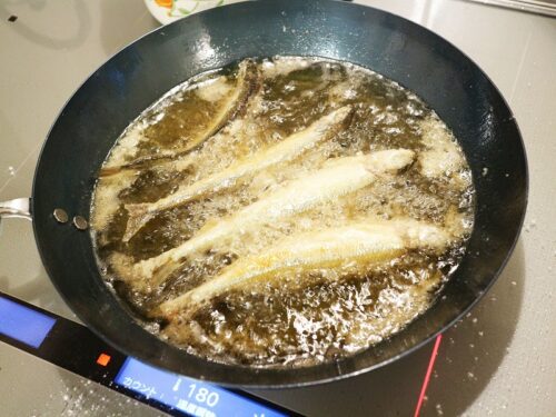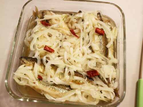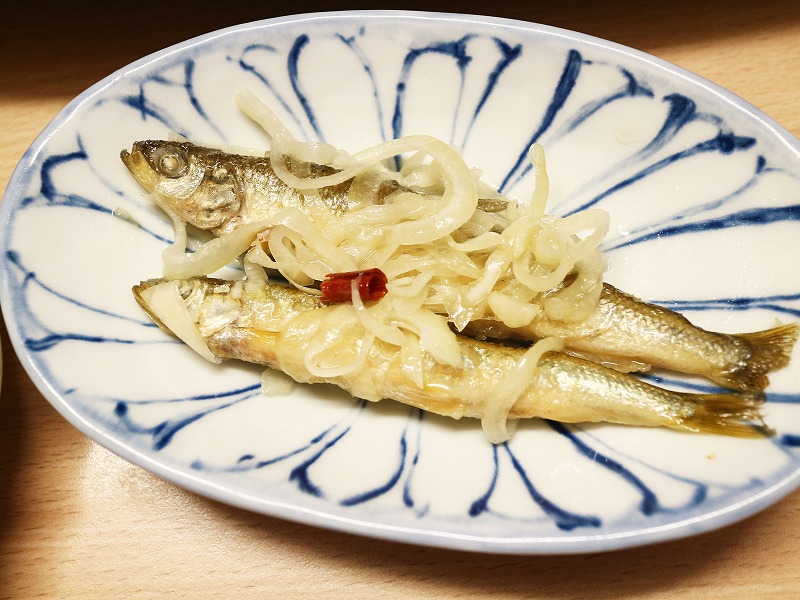 昨日スーパーでチカ(ワカサギの大きいの)を見つけたので、昨夜、白焼きしてから揚げて南蛮漬けいしておきました。