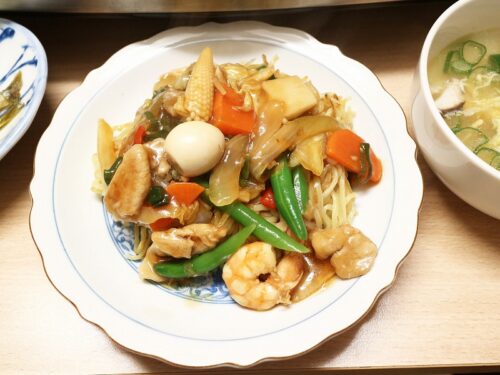 ■あんかけ焼きそば(豚肉・エビ・白菜・人参・筍・玉ねぎ・人参・インゲン・ベビーコーン・鶉の卵・椎茸・葱・生姜)