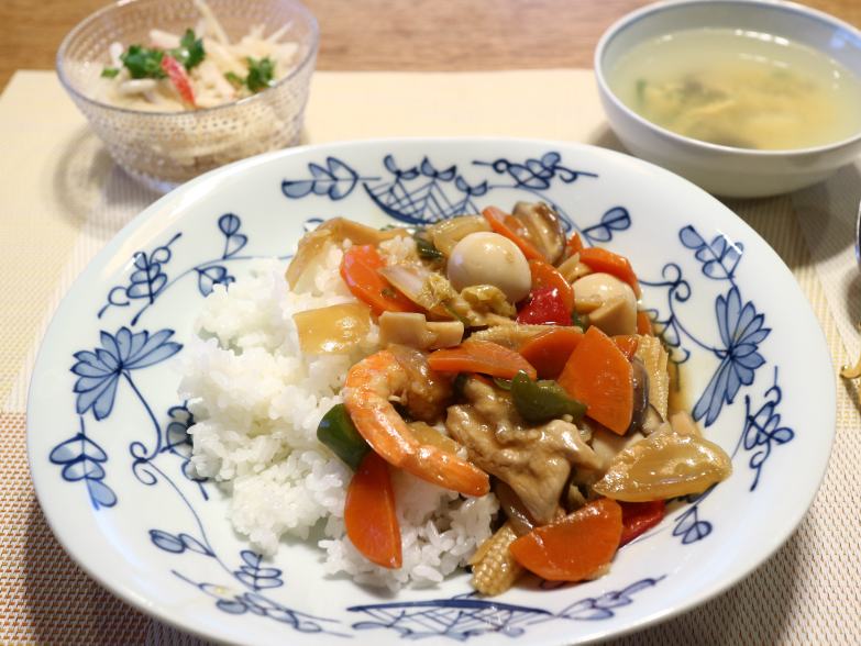 ■中華飯■大根サラダ(カイワレ・カニカマ)■スープ(昨日の残り)