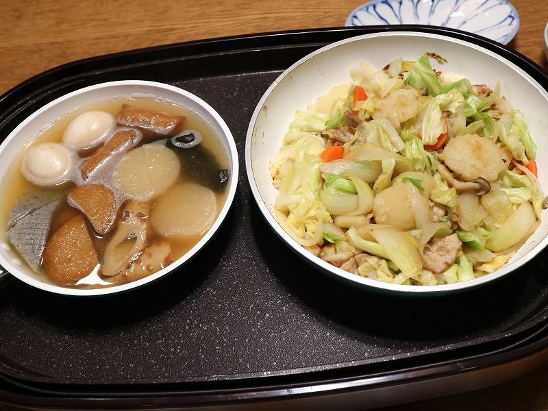 2/21-野菜炒めとおでん 投稿日時: 2026-02-21 投稿者: はるみん又々ホットプレートをウォーマー代わりに ■野菜炒め(豚肉・じゃが芋・キャベツ・人参・しめじ・玉ねぎ) ■おでん(酒悦のレトルト)■チカの南蛮漬け ■2026/02/21(土)晴/曇-1.2→+7.9