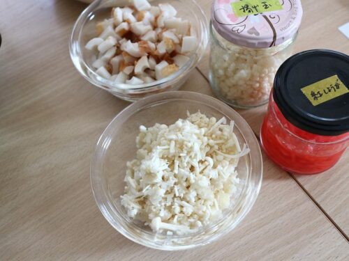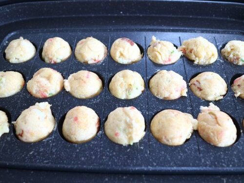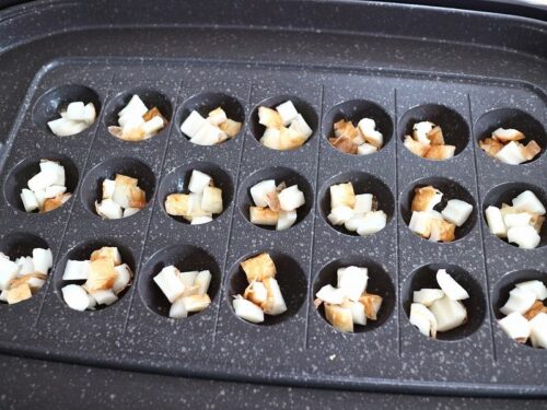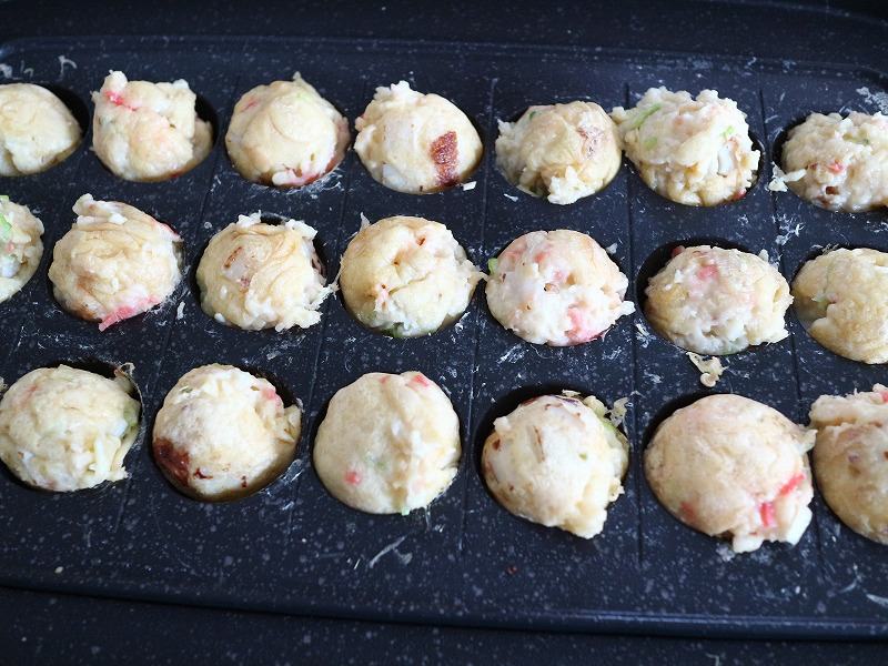 熱くしたたこ焼きの型に油を薄く敷いて、刻んだちくわを入れて