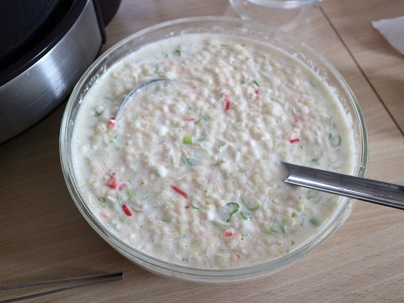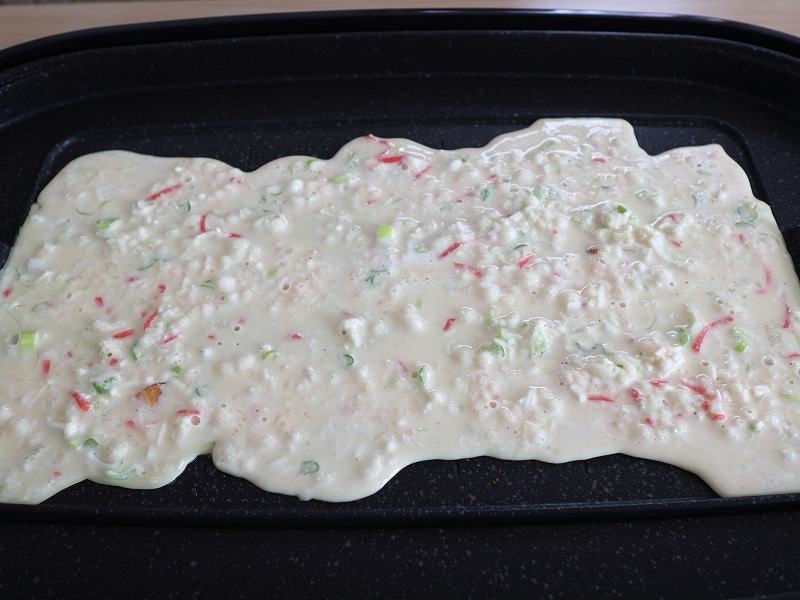 薄力粉200gに水500cc、和風だし小さじ1/2と白出し大さじ1