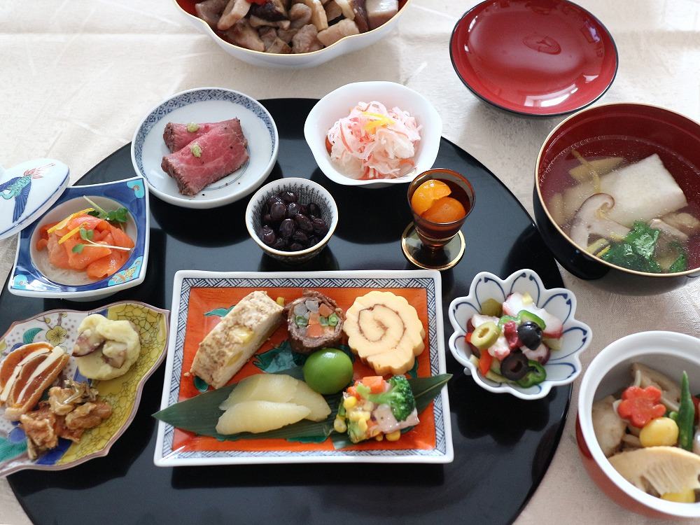 スモークサーモン・ローストビーフ・大根なます・黒豆・金柑シロップ煮
